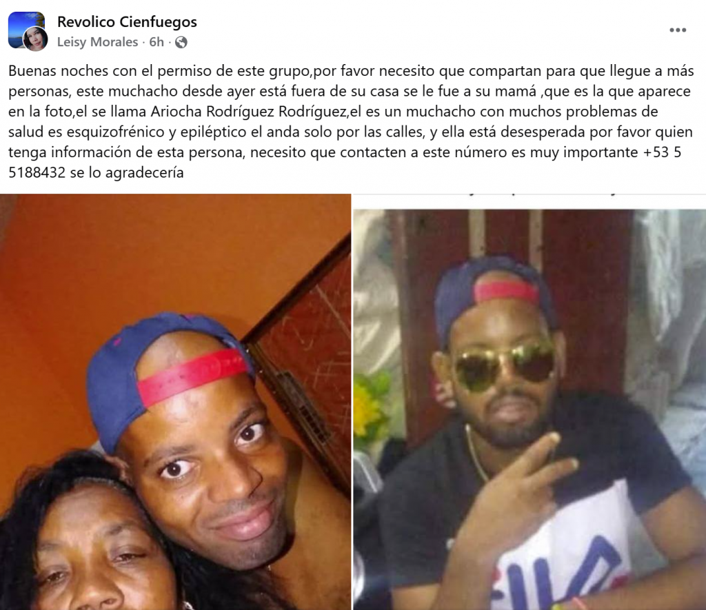 El primer caso fue publicado por Leisy Morales en un grupo de Facebook de Cienfuegos. Según su mensaje, desde el día anterior se encuentra fuera de su vivienda Ariocha Rodríguez Rodríguez, un joven con problemas de salud mental que padece esquizofrenia y epilepsia. De acuerdo con el testimonio, el muchacho salió de su casa y no ha regresado, lo que ha generado una situación de angustia para su madre, quien aparece en la imagen difundida junto a la publicación.