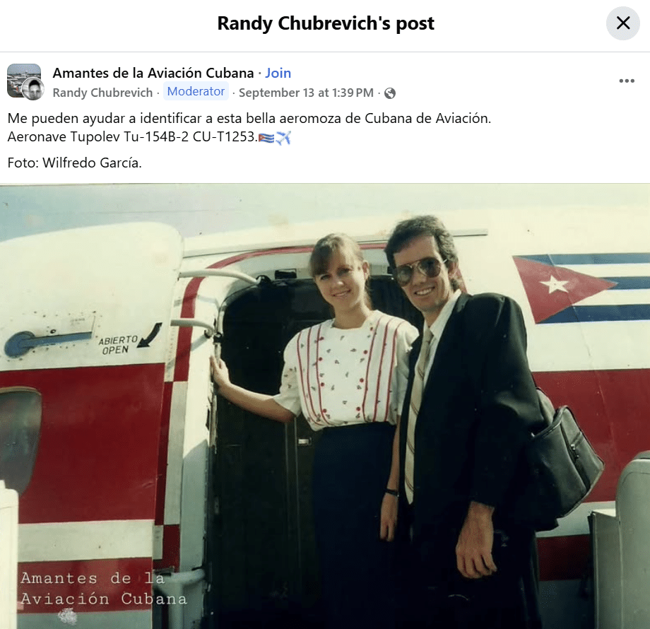 La escena nació como tantas historias entrañables de Facebook: una foto antigua, un grupo de nostálgicos y una pregunta lanzada al viento. En el foro “Amantes de la Aviación Cubana”, el moderador Randy Chubrevich publicó una imagen de cabina llena de aire noventero y dejó la intriga servida: “Me pueden ayudar a identificar a esta bella aeromoza de Cubana de Aviación. Aeronave Tupolev Tu-154B-2 CU-T1253. Foto: Wilfredo García”. Bastaron horas para que empezaran a llegar las conjeturas, los recuerdos y, por supuesto, los nombres. Entre los primeros en responder, varios coincidieron: “Marilyn Palomino”. La memoria colectiva hizo el resto.