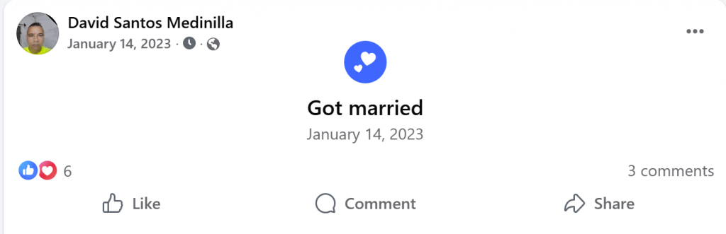 Una vez cumplida la misión, Medinilla habría comenzado una relación con Deini Condesa Sandoval, la hija de Eristida Sandoval, quien se desempeña como secretaria del Registro Civil en Trinidad. David Santos Medinilla y Erístida son amigos en Facebook. En su perfil de Facebok aparece en al menos dos fotos con Deini Condesa.