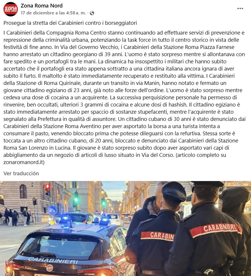La presencia de cubanos vinculados a robos en Italia ha sido especialmente notoria este 2025. El 10 de abril de este año, tuvo lugar el arresto en Roma de un cubano de 30 años por hurto agravado después de robar mochilas a dos turistas que almorzaban en una terraza del centro histórico; según el reporte, usaba auriculares para coordinarse con un cómplice y aplicaba la llamada “técnica de la chaqueta” para ocultar el movimiento de la mano al sustraer los objetos.
