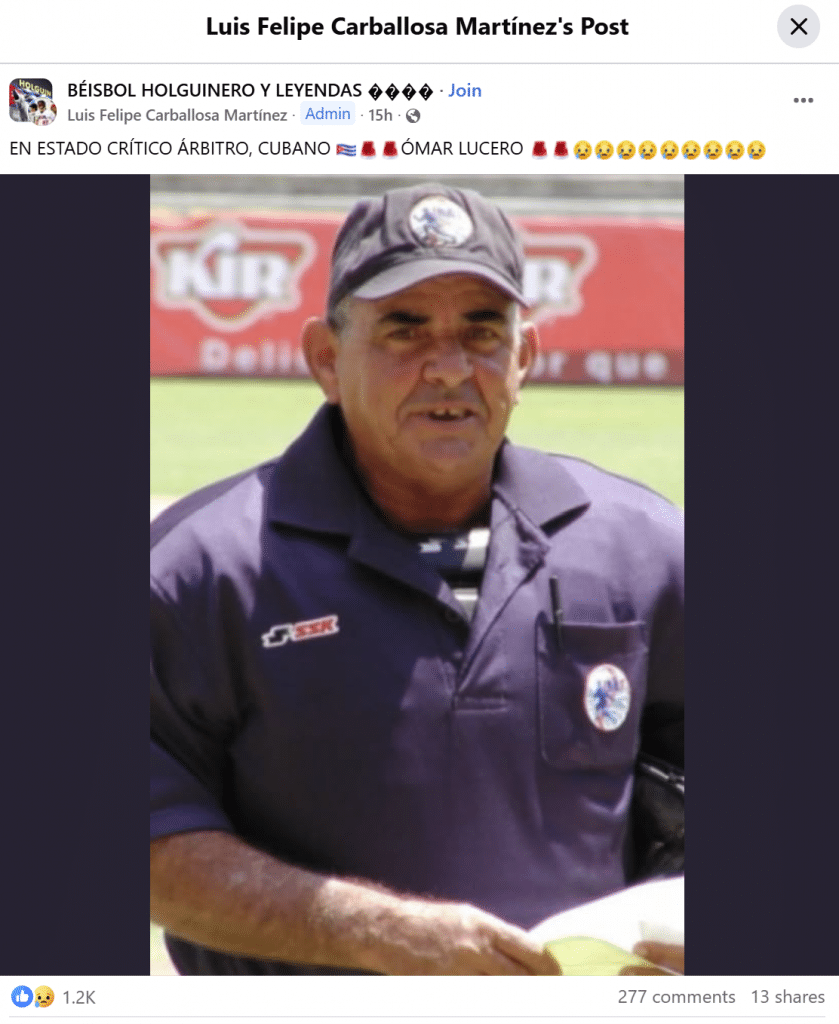 Luis Felipe Carballosa Martínez, administrador del grupo de Facebook “Béisbol holguinero y leyendas”, ha publicado hace 15 hrs un mensaje breve y directo que ha desatado centenares de reacciones en las redes. Según lo dicho por Carballosa Martínez, Ómar Lucero, un árbitro destacado del béisbol cubano se encuentra «en estado crítico».