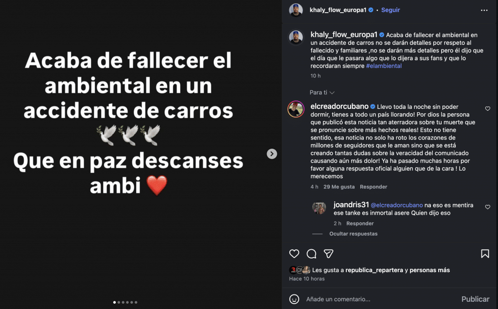 Mientras muchos usuarios expresaban su dolor por la supuesta pérdida, otros comenzaron a preguntarse si se trataba de una estrategia de marketing o incluso de un hackeo de sus redes. “¡Llevo toda la noche sin poder dormir; tienes a todo un país llorando! ¡Por Dios, la persona que publicó esta noticia tan aterradora sobre tu muerte que se pronuncie sobre más hechos reales!”, escribió el influencer El Creador Cubano en la sección de comentarios. Por su parte, el comediante Fabi Pan con aceite intentó aportar algo de calma: “Na, eso es mentira, tiene que ser que el personaje del ambiental se murió, pero no tú”.