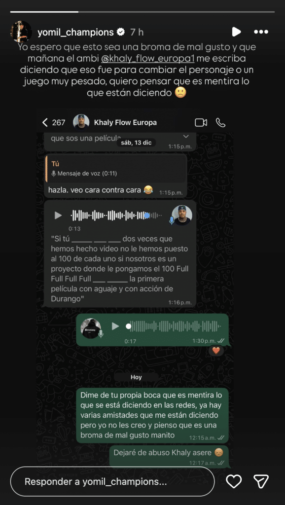 La incertidumbre fue tal que incluso figuras del panorama urbano cubano se sumaron a la ola de preocupación. El reguetonero Yomil Hidalgo, quien ha colaborado en varias ocasiones con El Ambiental para contenido en Instagram, compartió en sus propias redes capturas de los mensajes privados que había enviado a Khaly Flow, aún sin obtener respuesta. Su gesto avivó todavía más el debate y la sensación de alarma entre los fans.