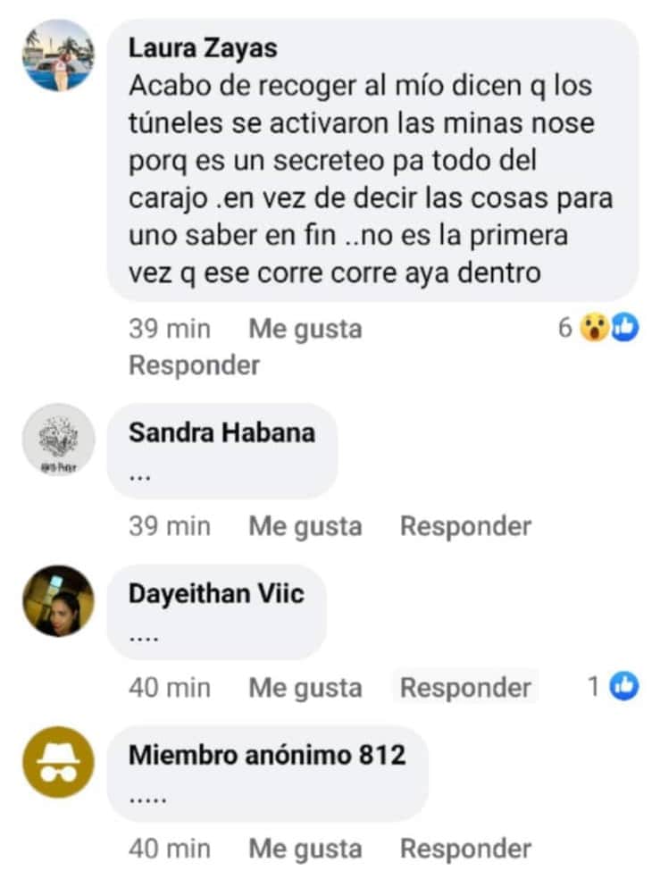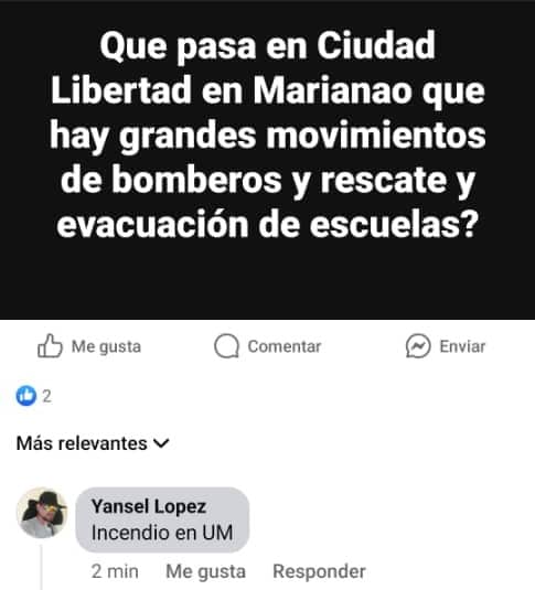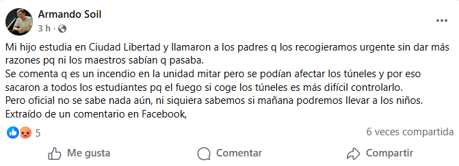“Mi hijo estudia en Ciudad Libertad y llamaron a los padres para que los recogiéramos urgentemente sin dar más razones porque ni los maestros sabían qué pasaba. Se comenta que es un incendio en la unidad militar, pero se podían afectar los túneles y por eso sacaron a todos los estudiantes porque el fuego, si coge los túneles, es más difícil controlarlo. Pero oficialmente no se sabe nada. Ni siquiera sabremos si mañana podremos llevar a los niños”, comentó Luna Raguel en Facebook.