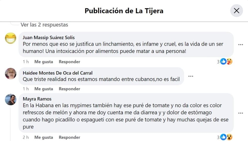 “Qué triste realidad. Nos estamos matando entre cubanos”; “No es de extrañar, pues la falta de control e higiene es abismal” y “Una intoxicación por alimentos puede matar a una persona”, opinaron otros.