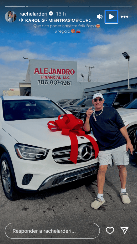“Qué rico poder hacerte feliz, papá. Tu regalo”, escribió Rachel junto a una foto de su padre sosteniendo las llaves de un automóvil y recostado a un vehículo con un gran lazo rojo: un reluciente Mercedes-Benz blanco.