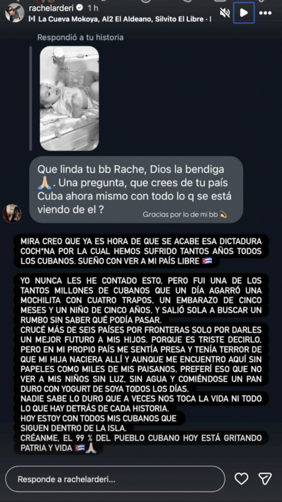 Al finalizar su mensaje, la influencer expresó solidaridad con los cubanos que permanecen en la isla y atraviesan las actuales dificultades. “Nadie sabe lo duro que a veces nos toca la vida ni todo lo que hay detrás de cada historia. Hoy estoy con todos mis cubanos que siguen dentro de la isla. Créanme, el 99% del pueblo cubano hoy está gritando ‘Patria y Vida’”, concluyó.