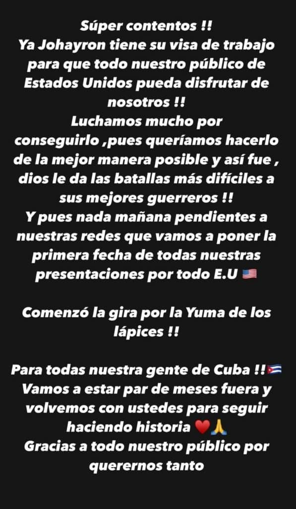 Charly y Johayron dieron la noticia a través de una transmisión en directo donde también participó el mánager de ambos, Raimel Pérez. “¡Los sueños se cumplen! Llegaron los lápices a la yunai. Mañana decimos la primera fecha”, escribieron al pie del video.