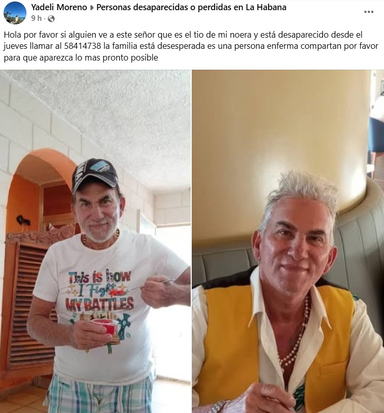 En La Habana, la alerta más reciente que ha ganado visibilidad se relaciona con un hombre residente en Mulgoba, en el municipio Boyeros, cuya desaparición fue denunciada en el grupo de Facebook “Personas desaparecidas o perdidas en La Habana” por una usuaria identificada como Yadeli Moreno.
