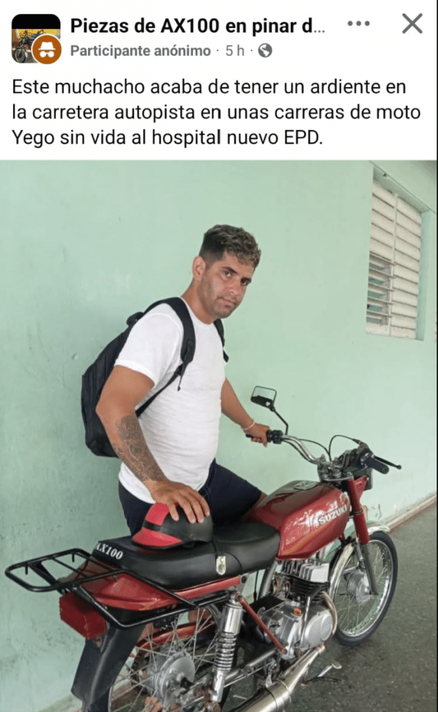 El tercer caso proviene de un grupo comunitario de Pinar del Río dedicado al intercambio sobre piezas de motos AX100. Allí, un usuario publicó de forma anónima que un joven había sufrido un accidente en la autopista durante carreras de motos y que llegó sin vida al “hospital nuevo” y publicó una foto del presunto fallecido.