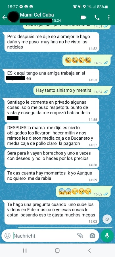 [16.11., 14:57] Mami Cel Cuba: DESPUES la mama me dijo es cierto obligados los llevaron hacer mitin y nos reimos les dieron media caja de Bucanero y media caja de pollo claro la pagaron