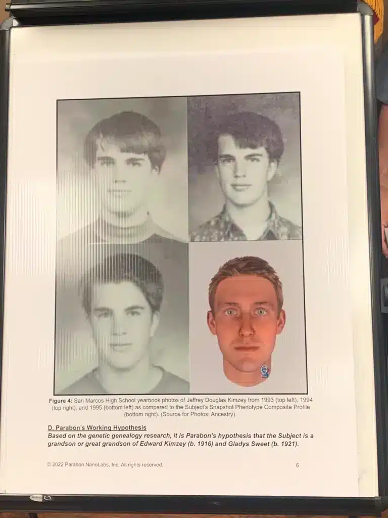 La identificación positiva de Jeffrey Kimzey fue posible gracias a las pruebas de ADN y la investigación genealógica. Parabon Nanolabs proporcionó una interpretación fotográfica de la víctima basada en un análisis de ADN.