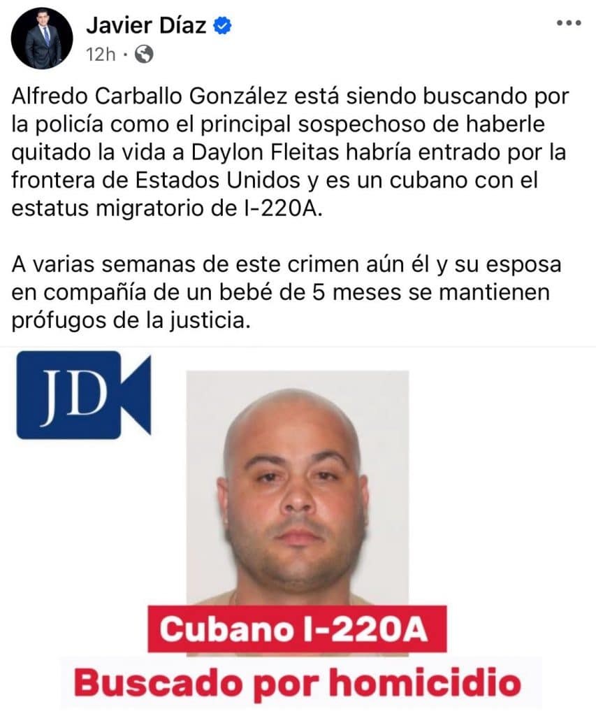 Alfredo Carballo, un cubano de 32 años que sigue siendo buscado por la policía del condado de Miami-Dade, Florida, como el principal sospechoso del asesinato del también cubano Daylon Fleitas, no tiene estatus legal en Estados Unidos ya que le fue otorgado un formulario I-220 tras entrar por la frontera sur, según informó este martes el periodista de Univisión 23, Javier Díaz.