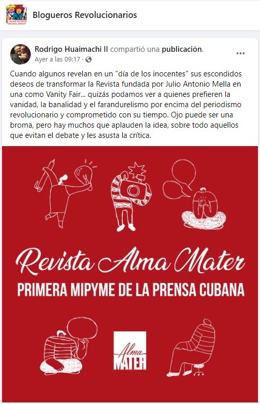 «Cuando algunos revelan en un «día de los inocentes» sus escondidos deseos de transformar la Revista fundada por Julio Antonio Mella en una como Vanity Fair… quizás podamos ver a quienes prefieren la vanidad, la banalidad y el farandurelismo por encima del periodismo revolucionario y comprometido con su tiempo. Ojo puede ser una broma, pero hay muchos que aplauden la idea, sobre todo aquellos que evitan el debate y les asusta la crítica,» pùblicó Huimachi en el grupo. Una crítica que a muchos no les cayó ni regular, pero que a otros sí les pareció correcta.