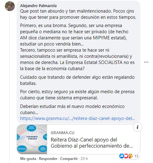 Lo cierto es que el ataque estaba enfocado básicamente en la broma. En el hecho de que la revista Alma Mater «pensase siquiera» en ser una mipyme. En la crítica, los ultraizquierdistas de La Manigua, confundieron coles con lechugas, y confundieron el término de la gestión empresarial, mipyme, con «empresa privada».