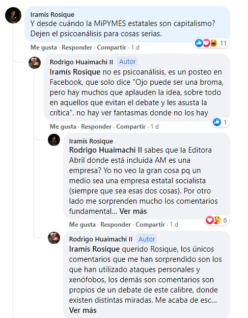 De un lado, los progres: Paquito el de Cuba, Alejandro Palmarola e Iramis Rosique; en la otras esquina del cuadrilátero, Rodrigo Huimachi, criticando ferozmente al Consejo Editorial de la Revista Alma Mater por no aceptar ningún señalamiento o crítica, y recriminándoles que no hayan querido ir al chat del grupo de La Manigua, en Telegram «a debatir».