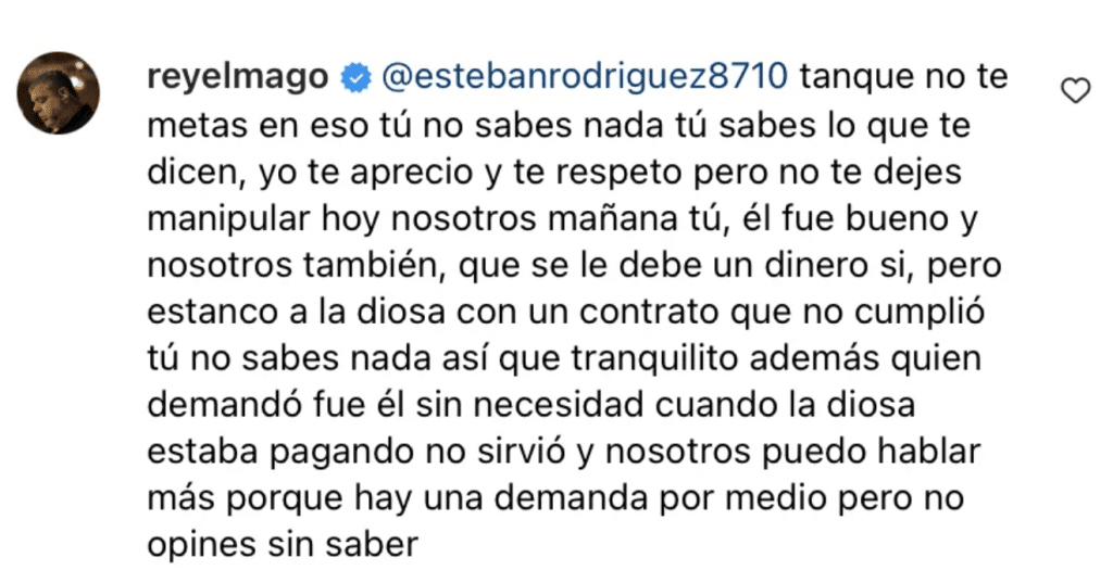 En respuesta, Rey El Mago salió a la defensa de su pareja y aseguró que la situación es más compleja de lo que parece. “No opines sin conocer toda la historia. Se le debe dinero, sí, pero él no cumplió con el contrato y estancó la carrera de La Diosa”, dijo el productor.