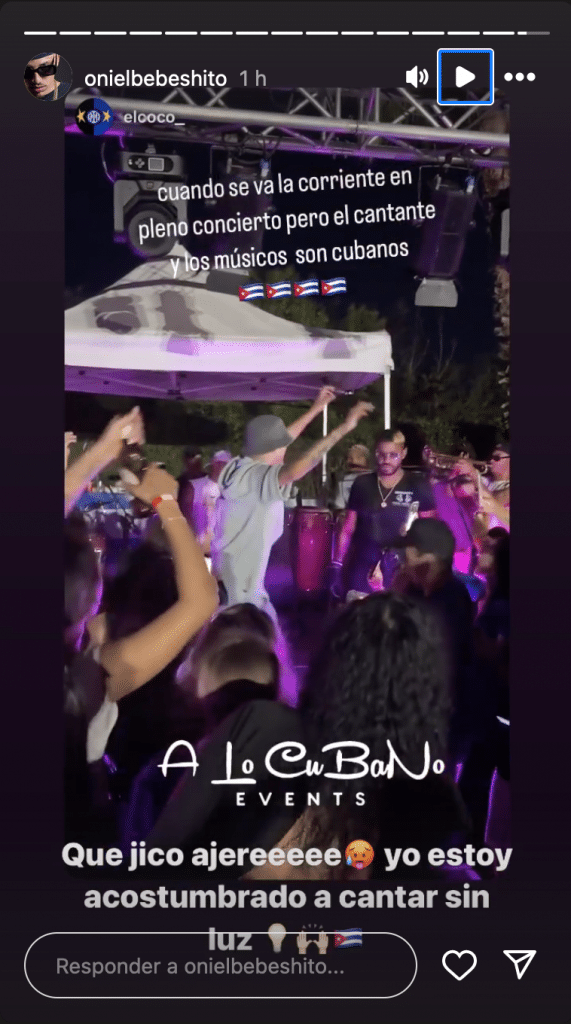 Varios usuarios lo compartieron en sus historias con frases como: “cuando se va la corriente en pleno concierto, pero el cantante y los músicos son cubanos”, mientras Bebeshito contestaba: “ya estoy acostumbrado a cantar sin luz”.