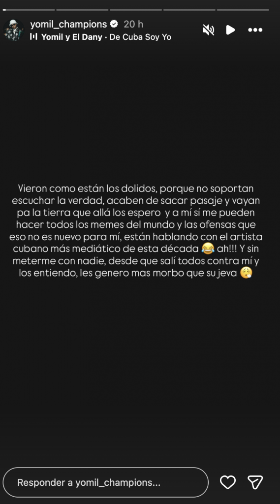 “Vieron cómo están los dolidos, porque no soportan escuchar la verdad…”, escribió el artista, en un mensaje que rápidamente comenzó a circular entre sus seguidores. Lejos de suavizar el tono, Yomil elevó el nivel de confrontación al dirigirse a quienes opinan desde fuera de la isla: “Acaben de sacar pasaje y vayan pa’ la tierra que allá los espero”.