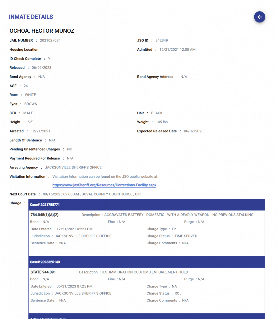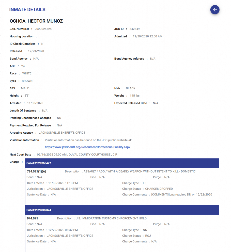 Cumplió tiempo bajo custodia del condado de Duval hasta junio de 2023, fecha en que fue liberado nuevamente tras cumplir sentencia. Durante ese proceso también se le aplicó una retención por parte de ICE para ser deportado, pero la orden nunca se ejecutó.