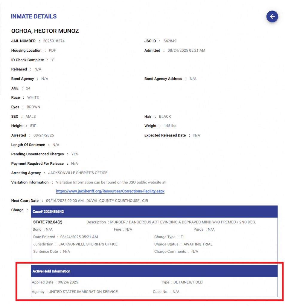 Muñoz-Ochoa fue detenido y enfrenta ahora cargos de asesinato en segundo grado por un acto “peligroso, evidenciando una mente depravada sin premeditación”, según la acusación estatal. Permanece en la cárcel del condado de Duval, sin derecho a fianza, y su próxima audiencia está fijada para el 16 de septiembre. Y esta vez también le ha sido puesta una retención por parte de ICE.