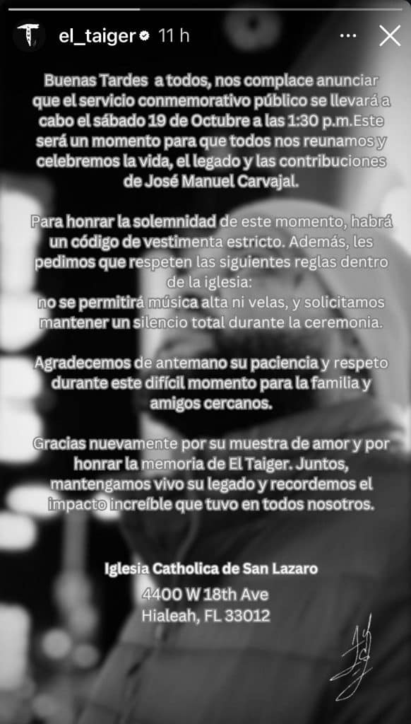 Un comunicado divulgado en las redes sociales de El Taiger precisa que la despedida comenzará a las 13:30 en la iglesia ubicada en el 4400 W de la 18th Ave. “Este será un momento para que todos nos reunamos y celebremos la vida, el legado y las contribuciones de José Manuel Carvajal”, se lee en la nota.