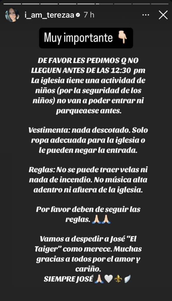 “La iglesia tiene una actividad de niños. Por la seguridad de los niños, no van a poder entrar ni parquearse antes. Vestimenta: nada descotado. Solo ropa adecuada para la iglesia o le pueden negar la entrada. Reglas: No se puede traer velas ni nada de incendio. No música alta adentro ni afuera de la iglesia. Por favor deben de seguir las reglas”, pidió Teresa desde sus redes.