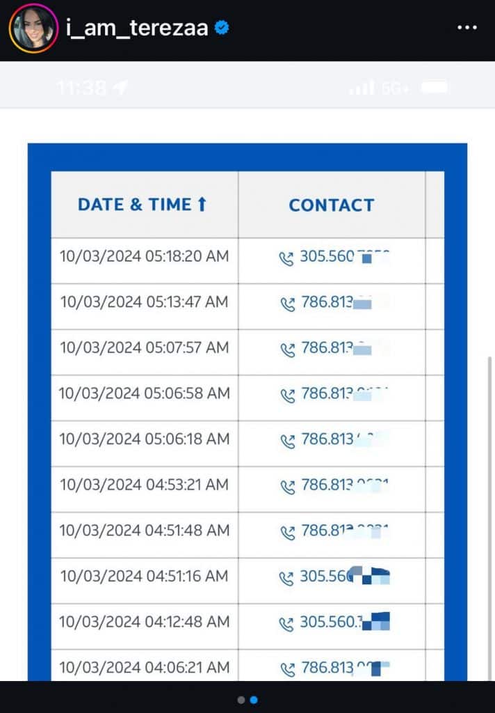 “Estas son llamadas y mensajes del celular de José (ya esto yo se lo había dado a policía el mismo 10/3/24) Ahora, yo me pregunto quién hizo estas llamadas, si a José le dispararon a las 04:30 a.m. Entonces, ¿quiénes son esta gente?, ¿quién usó el celular de José y para qué llamar de su celular?”, se preguntó Teresa en una publicación de Instagram.