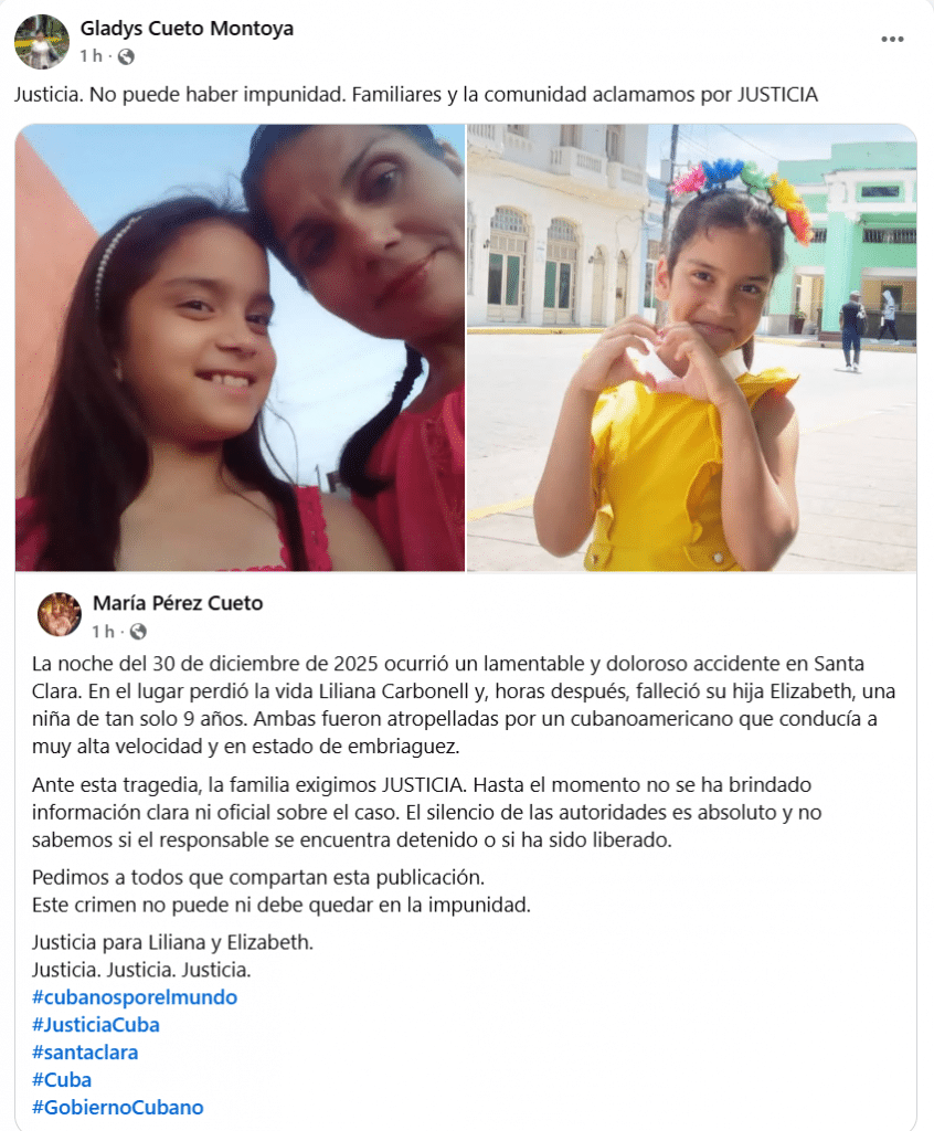 El dolor ha sido especialmente visible en los mensajes compartidos por Ionel Díaz Suárez, padre de la niña, quien ha despedido a Elisabet Isel con textos cargados de afecto y desconsuelo, recordándola como una presencia luminosa en la vida familiar. La muerte de la menor y de su madre deja además a dos adolescentes huérfanos y a una familia rota por una pérdida doble que enluta el inicio de 2026 en Villa Clara.