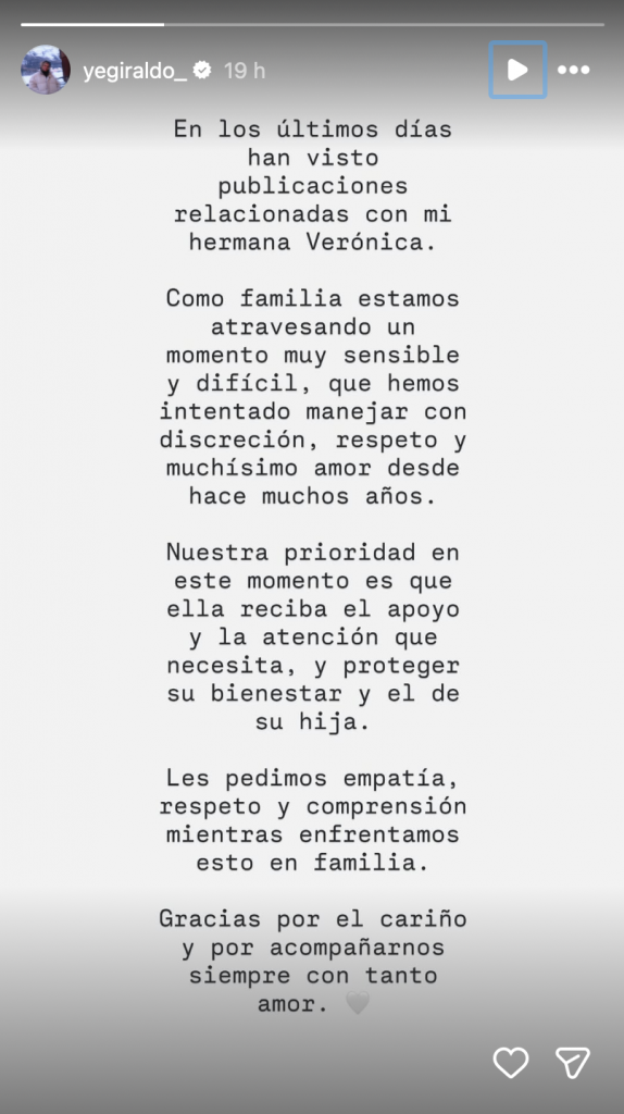 En sus publicaciones más recientes, Verónica se mostró visiblemente alterada y denunció que su expareja ha orquestado una estrategia para hacerla parecer “inestable” ante la justicia y así ganar la custodia. Sin embargo, el golpe más bajo, según sus palabras, viene desde adentro: aseguró haber descubierto que parte de su propia familia no solo no la apoya, sino que estaría respaldando al padre de la menor.