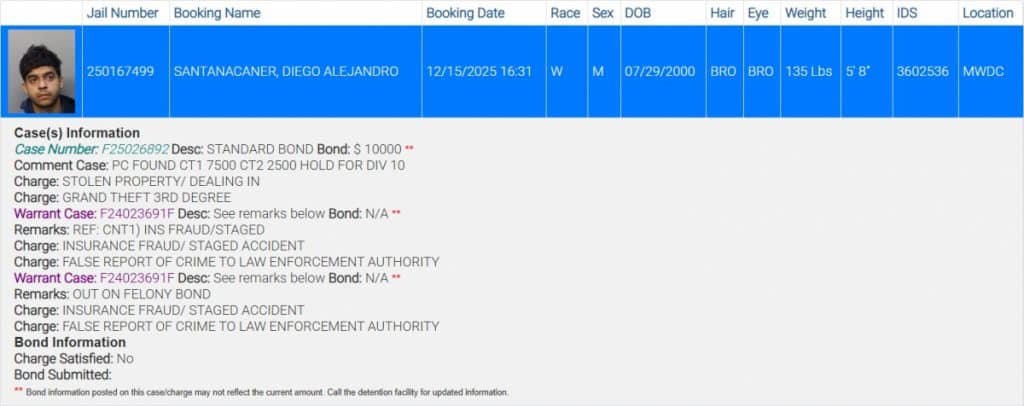Hasta el martes figuraba detenido en el Turner Guilford Knight Correctional Center con una fianza de 10,000 dólares, y además permanecía bajo custodia por una presunta violación de libertad condicional relacionada con un caso previo de simulación de accidente y denuncia falsa.