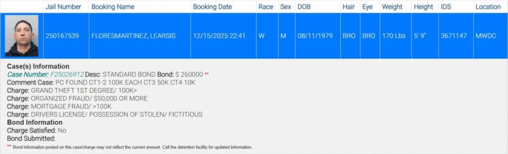 El caso fue denunciado tras una reclamación presentada por el prestamista privado ante la aseguradora First American Title Insurance Company, vinculada a la compañía de títulos, y terminó en una investigación de la unidad de delitos organizados de la Oficina del Sheriff de Miami-Dade. Flores Martínez fue recluido en el Turner Guilford Knight Correctional Center y su fianza fue fijada en 260,000 dólares.