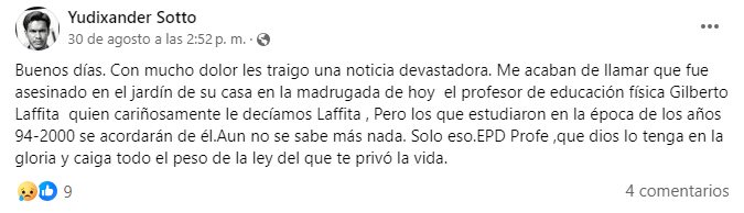 “Con mucho dolor les traigo una noticia devastadora. Me acaban de llamar que fue asesinado en el jardín de su casa, en la madrugada de hoy, el profesor de educación física Gilberto Laffita, a quien cariñosamente le decíamos Laffita. Los que estudiaron en la época de los años 94-2000 se acordarán de él”, comentó el usuario Yudixander Sotto.