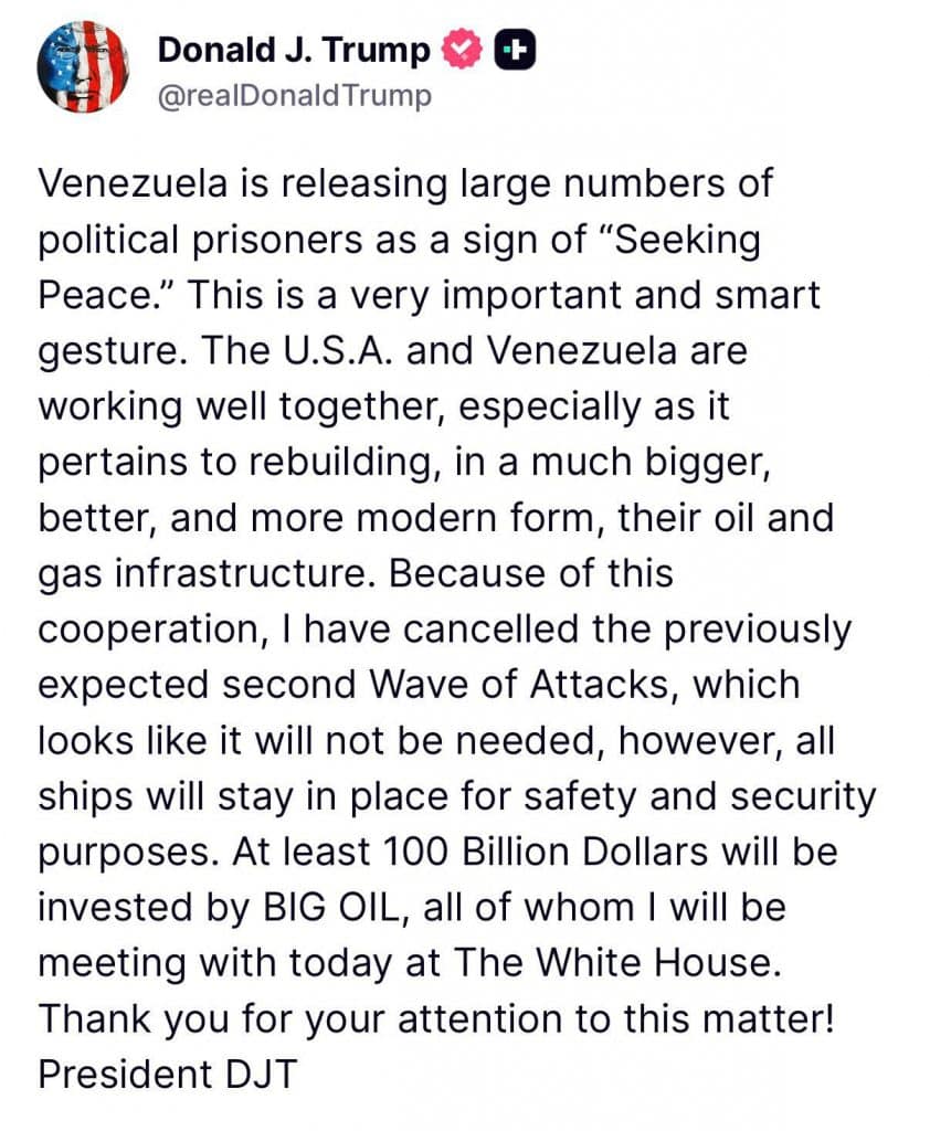En un mensaje publicado en la madrugada en la plataforma Truth Social, Trump elogió la cooperación de los nuevos dirigentes de Venezuela, lo que incluye la liberación de presos políticos.