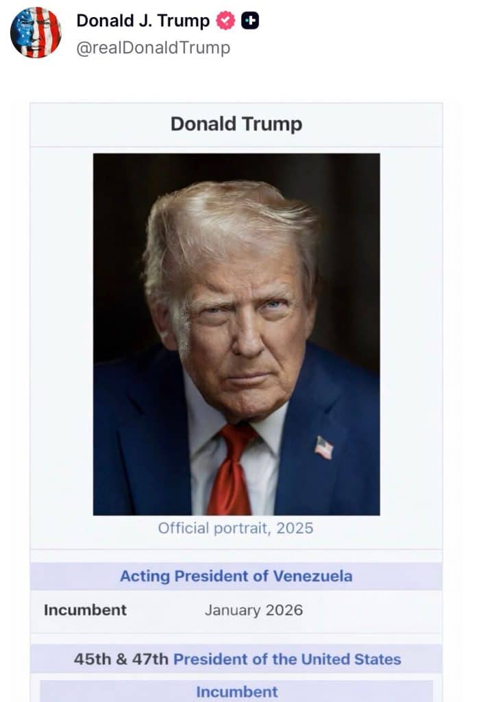 El presidente de Estados Unidos, Donald Trump, volvió a despertar polémica este domingo en Truth Social, donde publicó en la noche una imagen falsa de una página de Wikipedia que se refiere a sí mismo como el “Presidente interino de Venezuela” desde enero de 2026.