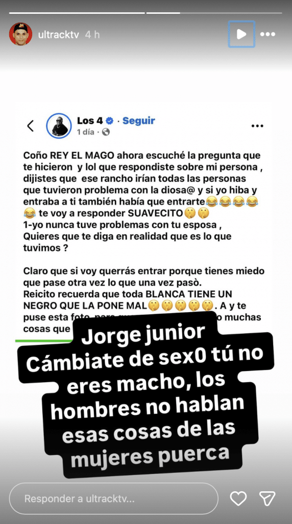 En medio del cruce entre Jorge Junior y Rey El Mago, Ultrack se metió en la discusión y, aunque no atraviesa su mejor momento con la cantante cubana La Diosa, decidió plantarse públicamente en su defensa tras unos mensajes del líder de Los 4 cargados de insinuaciones personales.
