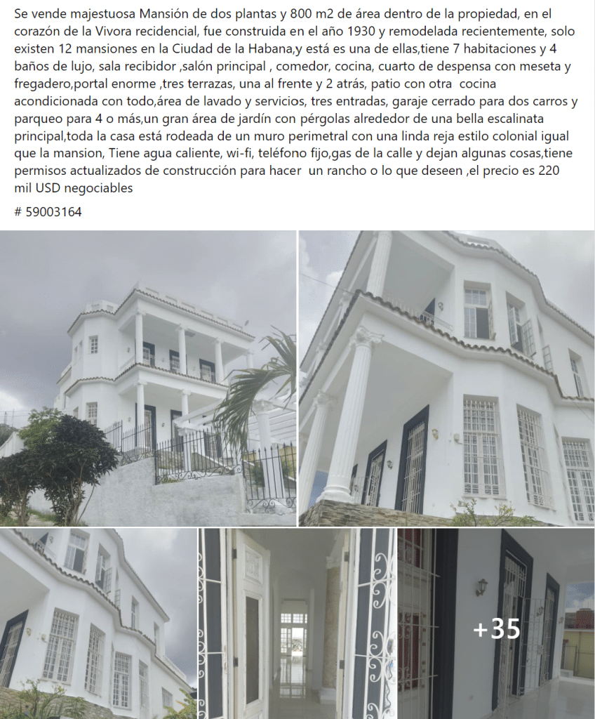 El anuncio, publicado en el grupo de Facebook de Compra y venta d casas baratas en la Habana indica que la “majestuosa” mansión posee dos plantas y 800 metros cuadrados de área dentro de la propiedad; siete habitaciones y cuatro baños de lujo, así como una sala recibidora, un salón principal, un comedor, una cocina, un cuarto de despensa con meseta y fregadero, y un portal de grandes dimensiones.