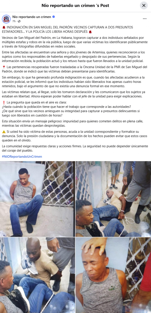 A diferencia del episodio habanero, la publicación subraya que aún no se conoce la identidad del detenido y pide colaboración para identificarlo, mientras alude a videos y fotos de la captura. No afirma, sin embargo, cuál fue el desenlace procesal ni si fue liberado o mantenido bajo custodia; solo deja claro que la comunidad lo interceptó y lo entregó, y que su nombre no estaba claro al momento del reporte.