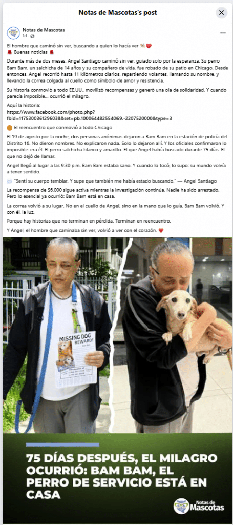 El pasado 5 de junio, la mascota desapareció de la casa de su dueño, Ángel Santiago, de 58 años, legalmente ciego debido a glaucoma. Dos hombres entraron a su jardín, lo tomaron y escaparon rápidamente. Santiago intentó detenerlos, sin éxito. Desde entonces, su silencio y su ceguera se mezclaban con un dolor inmenso: no solo había perdido a su compañero fiel, sino también a su guía diario, señalaba entonces la revista People.