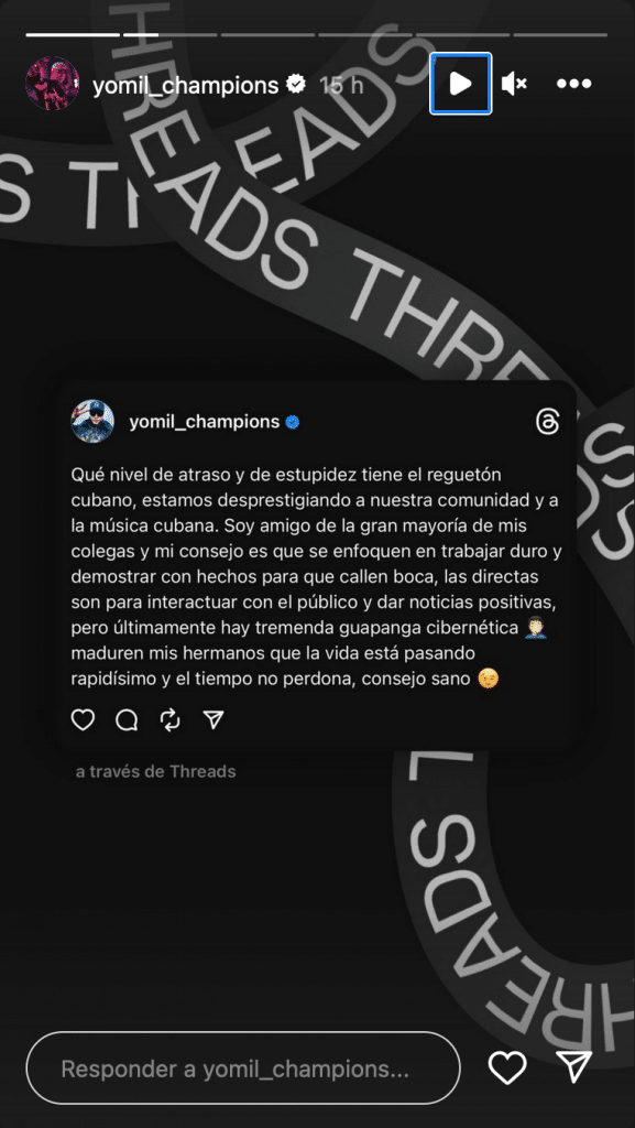 A través de su perfil en Threads y compartido en su historia de Instagram, Yomil ha dejado una reflexión para sus seguidores, comenzando con palabras bien contundentes: «Que nivel de atraso y estupidez tiene el reguetón cubano, estamos desprestigiando a nuestra comunidad y a la música cubana».