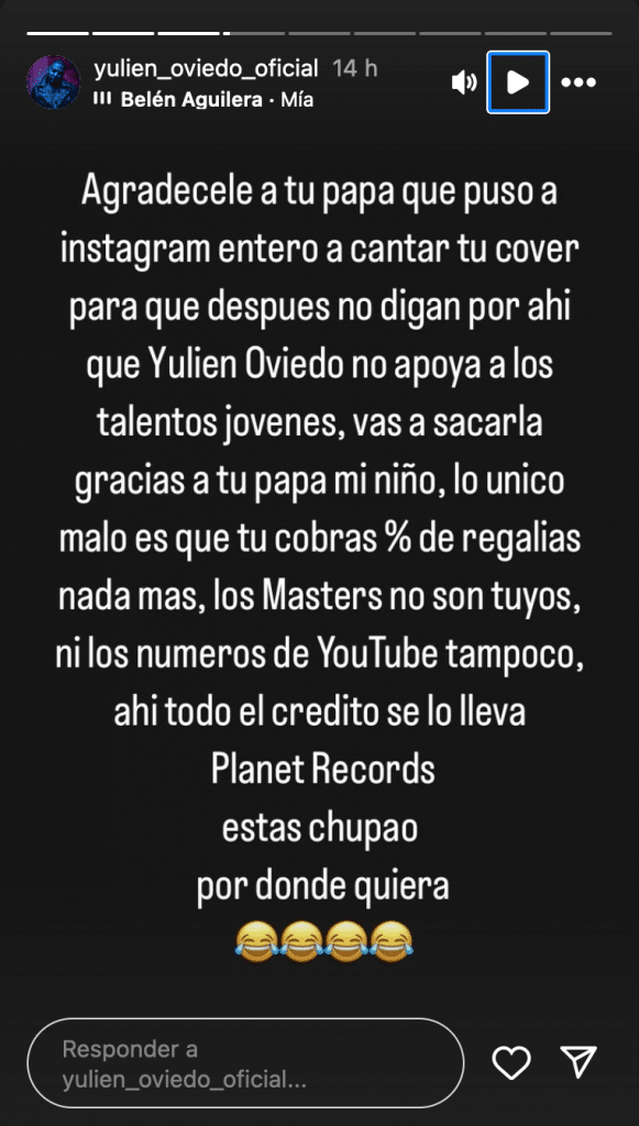 “Agradécele a tu papá que puso a Instagram entero a cantar tu cover para que después no digan por ahí que Yulien Oviedo no apoya a los talentos jóvenes. Vas a sacarla gracias a tu papá, mi niño”, comentó Oviedo en una historia de Instagram.