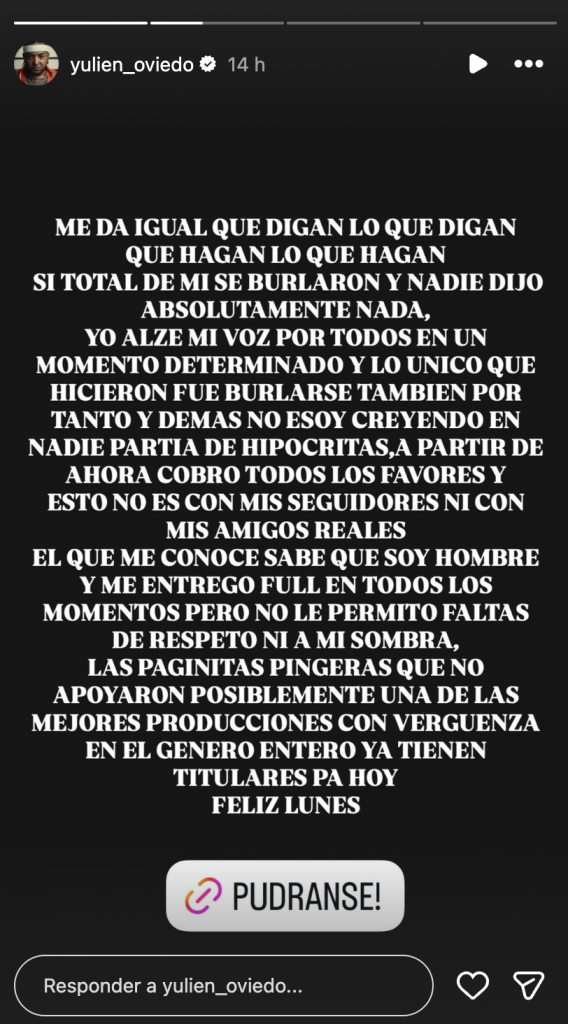 “No me importa lo que digan ni lo que hagan. De mí se burlaron y nadie dijo absolutamente nada. En un momento determinado levanté la voz por todos y lo único que hicieron fue burlarse también. Por eso ya no estoy creyendo en nadie, partida de hipócritas”, escribió Yulien, quien por estos días se encuentra promocionando su más reciente tema musical, “Bandolera”.